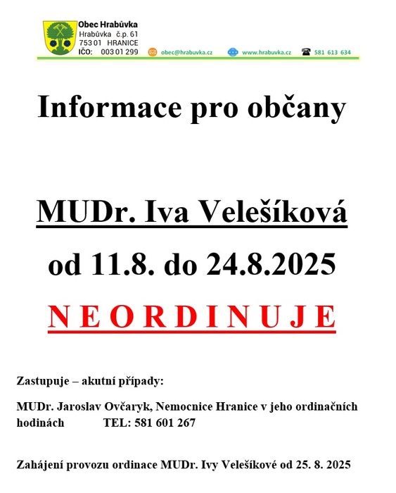 Úvod > Život v obci > Aktuality > MUDr. Iva Velešíková - DOVOLENÁ