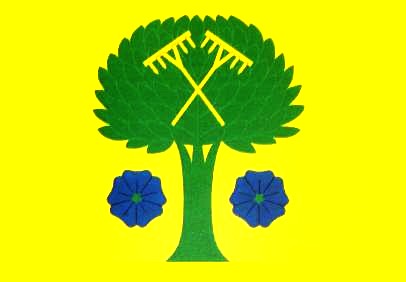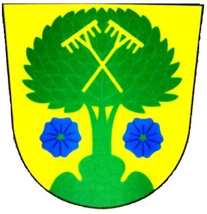 Ve zlatém štítě ze zeleného trojvrší vyrůstající zelený habr se dvěma zkříženými zlatými hráběmi v koruně, provázený dole dvěma modrými květy lnu se zelenými středy.